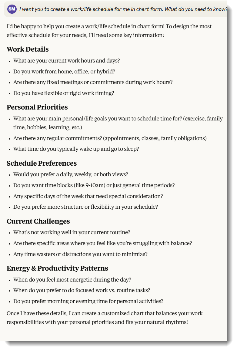 “I want you to create a work/life schedule for me in chart form. What do you need to know?”