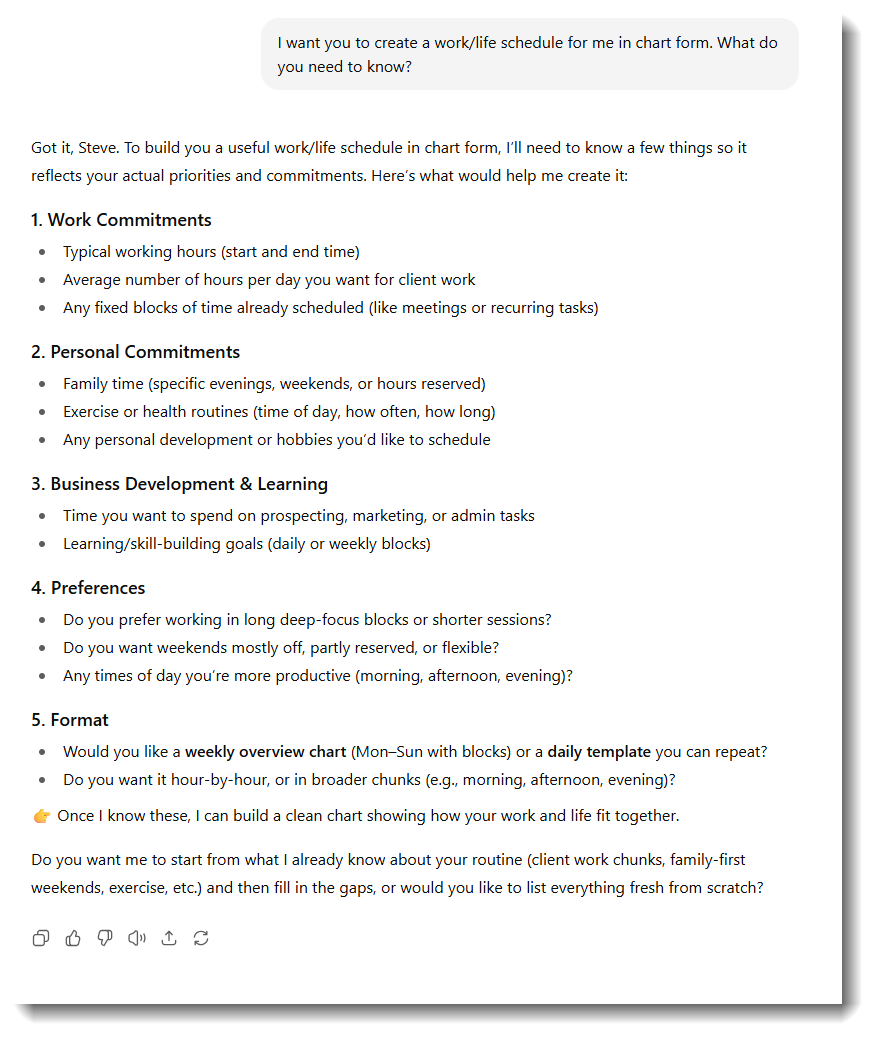 By the way, note how both AIs asked questions about family obligations and blocking out time for them. I think that’s important.